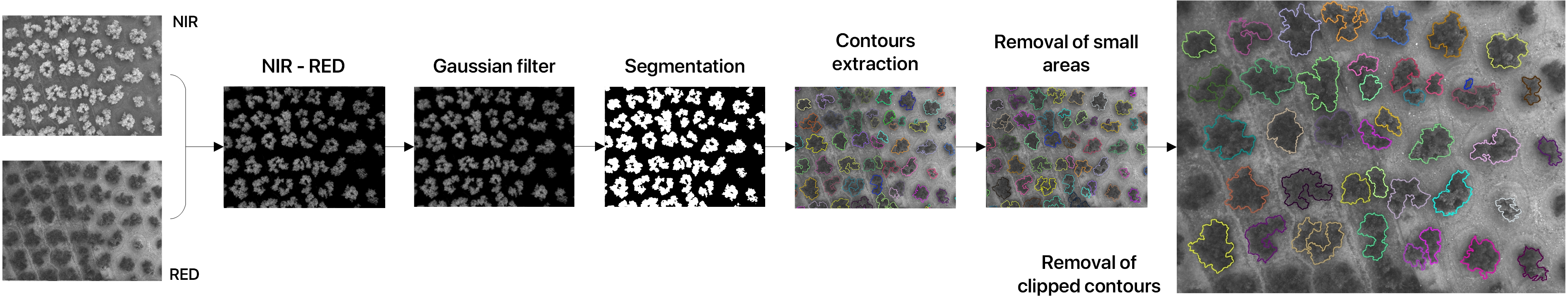 Multi-lens multispectral cameras allow us to record multispectral information for a whole area of terrain, even though we may only need the vegetation data. Based on the intensity of each multispectral image we can retrieve the contours of the trees that appear on the recorded terrain. However, multispectral cameras use a physically different lens for each range of wavelengths and misregistration effects could appear due to the different viewing positions. As these types of lenses are dedicated to capture larger areas of terrain, their focal distance is lower and because of this we get what is called a fisheye distortion. Therefore if we want to retrieve the shape of each tree and its multispectral data we need to process the channels so them all are representated as undistorted images under a same reference system.