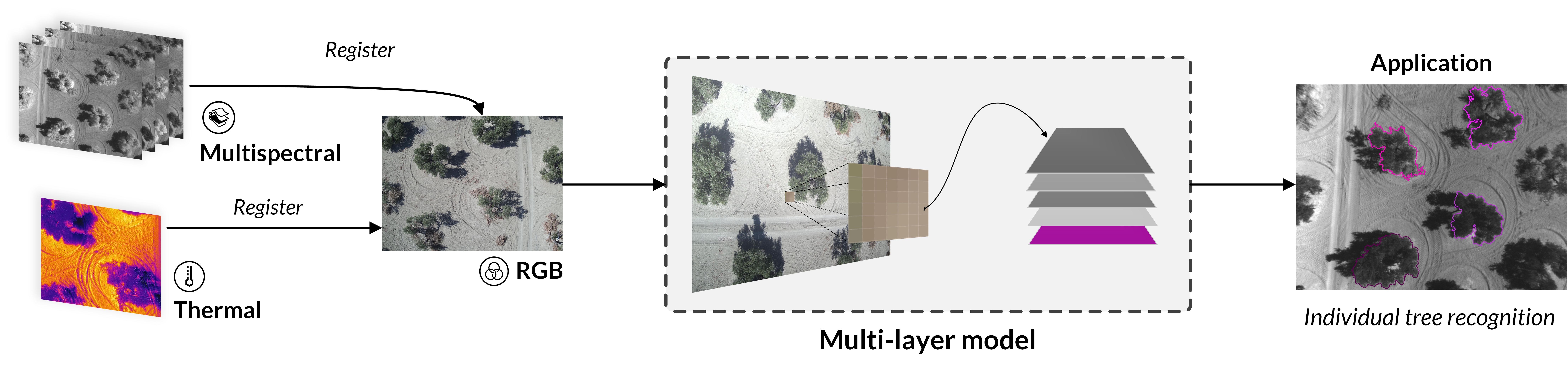 Multiple types of images provide useful information about a crop, but image fusion is still a challenge in Precision Agriculture (PA). We describe a framework which manages a multi-layer registration model of heterogeneous images obtained by an unmanned aerial vehicle (UAV) by proposing pair-to-pair steps through a registration method invariant to intensity differences, allowing us to connect different aerial images with significant differences. Correction of deformed images is treated as a first step to end up with our registration algorithms. These methods conform the base of more advanced systems that combine 2D and spatial information, therefore it represents the link of several types of images. The evaluation shows the flexibility of our framework when dealing with different requirements. Effectiveness of the Enhanced Correlation Coefficient method is proved and thus shown as a suitable method for the registration of heterogeneous images.