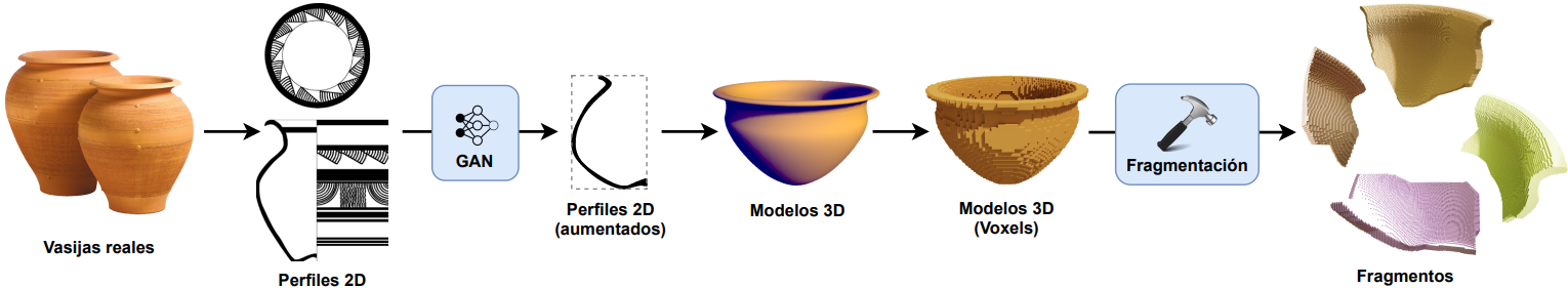 En los últimos años las técnicas de aprendizaje profundo se han convertido en una poderosa alternativa a técnicas clásicas de aprendizaje automático orientadas a tareas de clasificación. Esta tecnología se ha aplicado con gran éxito en diversos campos, si bien es necesaria la existencia de un conjunto de datos etiquetados muy grande para afrontar el entrenamiento de las mismas. En este trabajo se presenta un framework para la generación automática de fragmentos de vasijas de cerámica de torno, convenientemente etiquetados, de manera que permitan el entrenamiento de CNNs para la clasificación de dichos fragmentos, y su posterior utilización en tareas de reconstrucción.